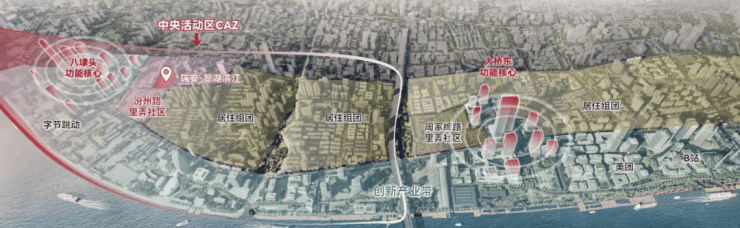其中,中央活动区内拥有中交集团上海总部、字节跳动上海滨江中心、中节能上海首座、八埭头综合体、东方渔人码头等地标产业&建筑。