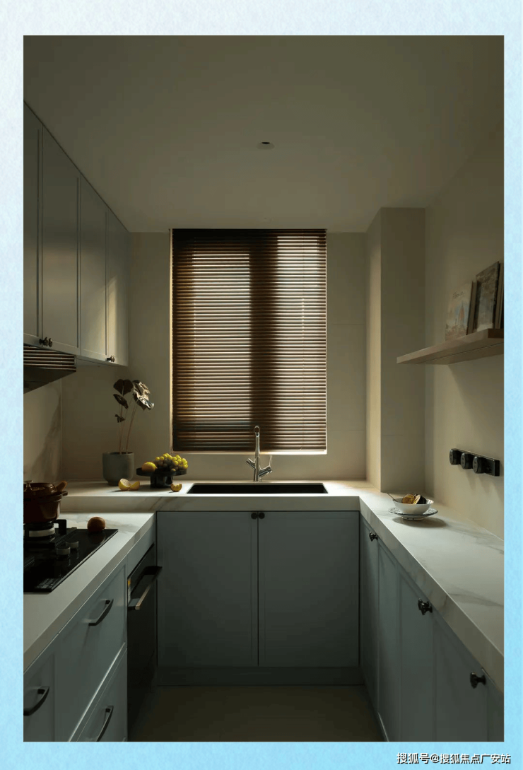 吧台与厨房内的台面顺畅相连,台面下方的柜体不仅增大了厨房物品的收纳空间,还扩展了操作台面的面积。水池台面与吧台齐平,而灶台高度则经过精心调整,以适应屋主的身高和厨房使用习惯。整个厨房以绿豆灰为主色调,搭配奶油色的墙砖,营造出一种既具烟火气又带清欢感的独特氛围,让屋主在烹饪时也能感受到那份难得的温馨与幸福。