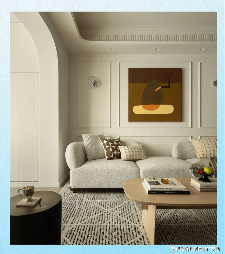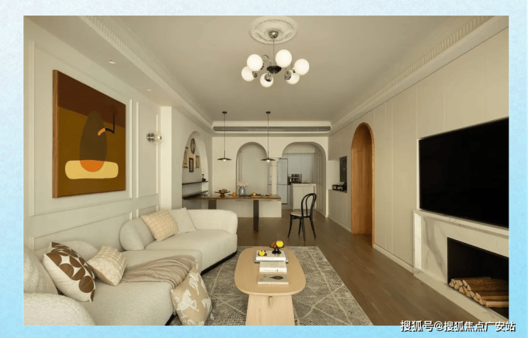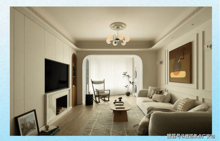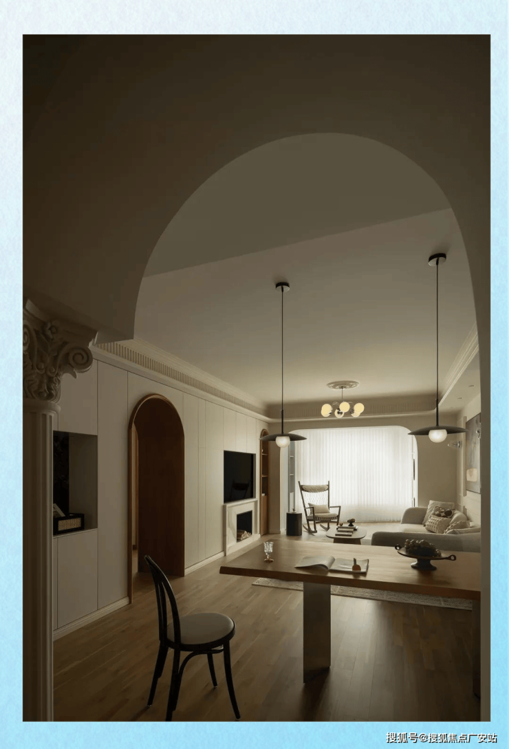 在客厅的空间设计上,我们秉持着简约而精致的原则。吊顶和沙发背景墙都以简洁的石膏线条装饰,营造出一种既古典又简约的氛围,避免了繁琐与复杂。此外,为了打破原有空间的沉闷,我们将客厅与阳台之间两个生硬的墙垛设计成拱形,这一巧妙处理不仅与玄关和餐厅的拱廊相得益彰,还与电视柜上别致的拱形开放书架形成了巧妙呼应。