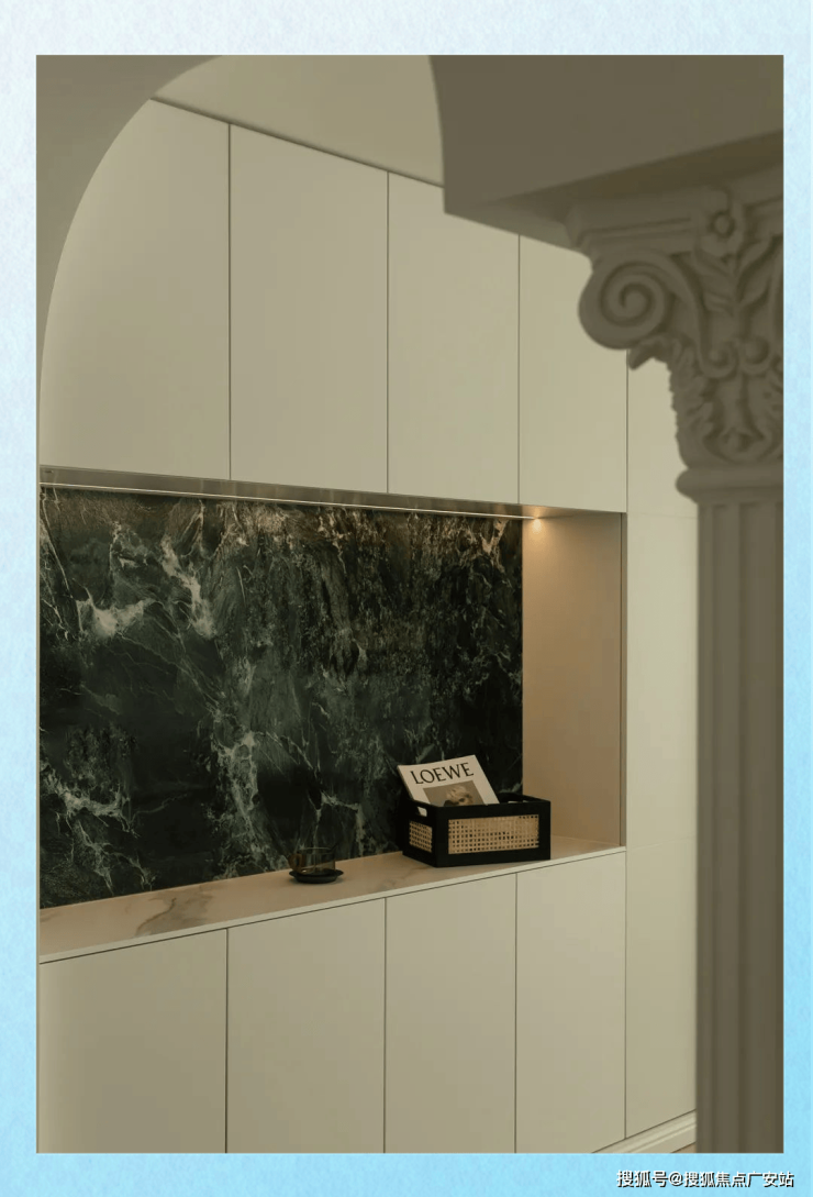 餐厅旁巧妙地布置了一个餐边岛台柜,其中咖啡机、直饮机、面包机等一应俱全,让美食享用者在不出厨房的情况下,就能轻松制作简餐,既便捷又充满温馨。此外,这个餐边柜还巧妙地转化为酒吧区,其内部空间足以容纳屋主珍藏的美酒。在欢聚的时刻,这里便成为调酒师施展技艺的舞台,让人尽情享受小酌的乐趣。而餐边柜中央,一块绿色石纹岩板装饰的开放区域,更是巧妙地融入了一条暖色灯带,为这个小空间增添了一抹别样的高级感。