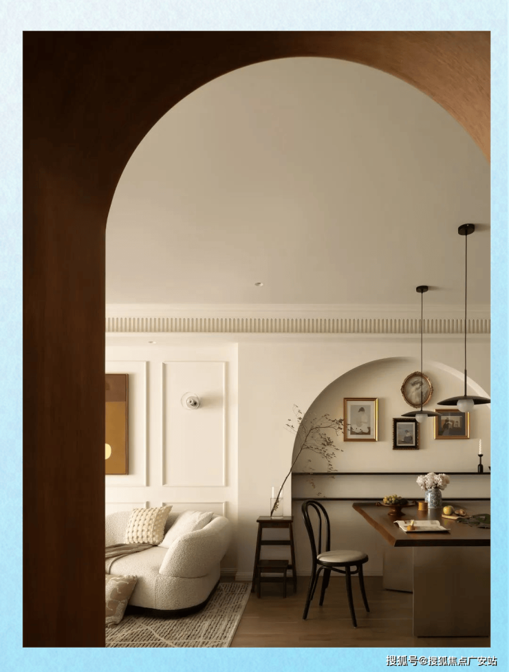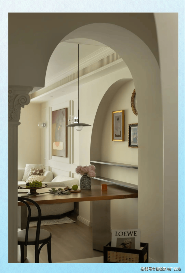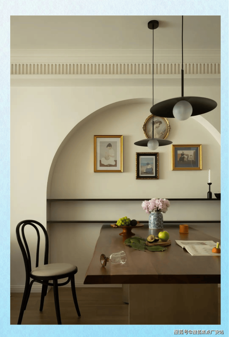 餐桌侧面,一道别致的内嵌拱门造型墙引人注目,两组隔板巧妙镶嵌其中,而隔板上方则是精心布置的挂画和家庭照片墙。在这里,一家人欢聚一堂,享受美食的同时,也能感受到墙上家庭照所映射出的那份温馨与幸福。