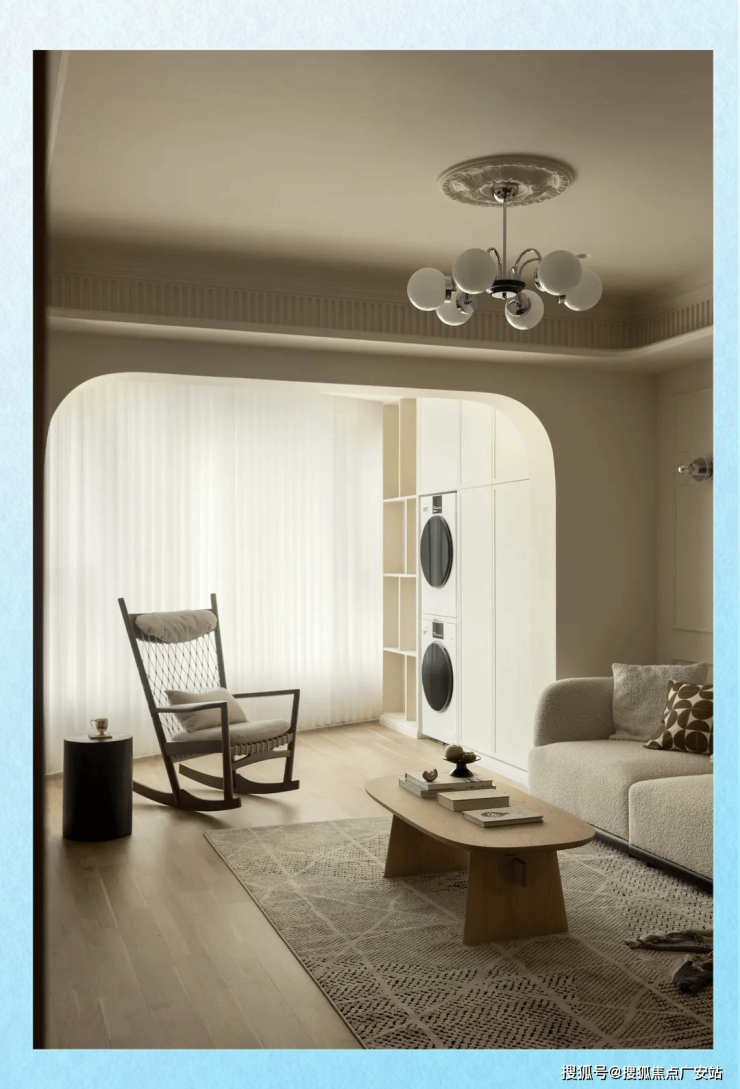 而为了满足晾晒的实际需求,我们精心选用了嵌入式的升降衣架,并在吊顶时进行预埋。这样,在不需要晾晒时,这个空间就可以完全转变为一个纯粹的休闲区域。同时,洗衣机、烘干机以及家政类储物柜的布置,使得晾晒、打扫的流程更加顺畅,相关物品的收纳也变得轻而易举。