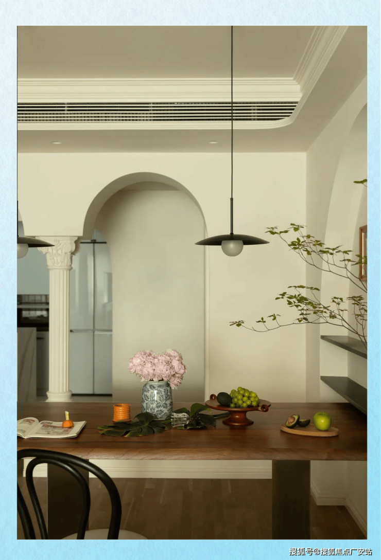 餐厅区域,几组精致的拱廊巧妙地围合出这个温馨的空间。