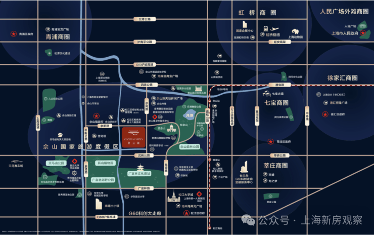 ��【交通配套】高速:沪渝高速、沪昆高速、上海绕城高速;地铁:9号线(佘山站);机场:虹桥枢纽;其他:有轨电车T5(规划)、佘山汽车站