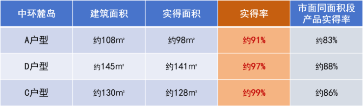 新规要求阳台面积最大不超过户型建面的10%,且不大于16平,这意味着上海百平户型基本告别三阳台设计。在当前上海新房市场,高层户型实得率普遍徘徊在83%-88%之间,中环麓岛则实现了全面突破。