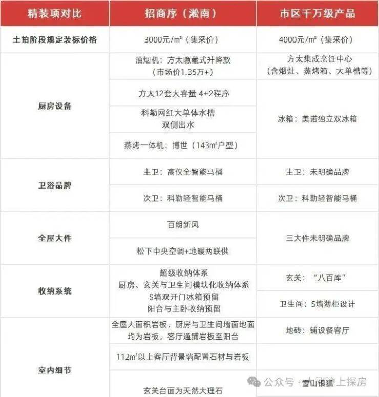 比如: “精装三大件”分别是松下(或同等品牌,下同)的空调地暧两联供、百朗的新风系统;主卫采用了唯宝洗脸盆、高仪的智能马桶、恒温花洒;厨房则是方太的燃气灶+油烟机+洗碗机、博世的蒸烤一体机等高端系列。入户定制轻卡门,钢芯结构外加高强度钢板,搭配博联七合一智能门锁。