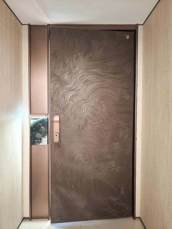 实景电梯厅铺设梵高印象岩板,电梯轿厢选用冷翡翠大理石。