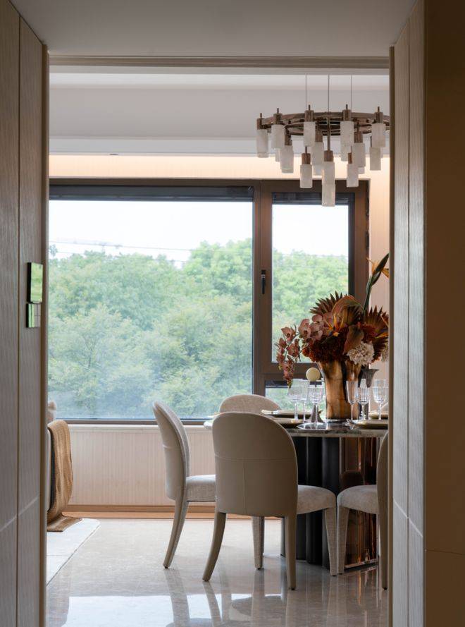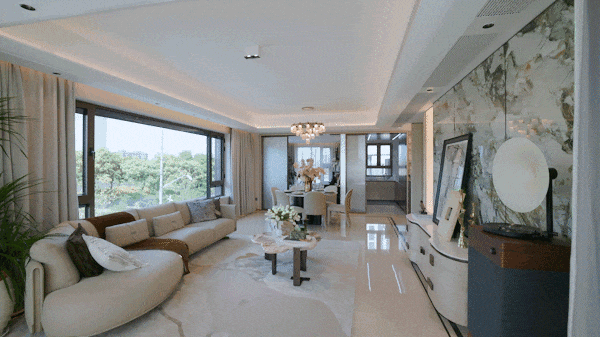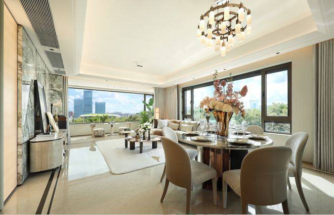 客厅是活动的核心区:约7.5米的面宽够阔绰,周末约朋友来聚餐,能摆下10人桌的长餐桌, 业主可以在270°环幕窗边直面百万方绿地的风景,孩童的笑声和窗外的鸟鸣混在一起。阳台和客厅打通后,视野直接“连到”公园,早上跑完步站在这里喝咖啡,能看到晨雾从树叶间散开,这种“把公园搬进家”的体验,在中环很少见。
