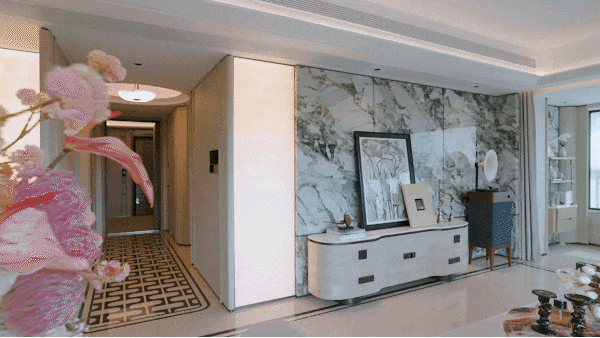 从私梯入户开始,仪式感就拉满了:电梯厅能放换季的行李箱和孩子的平衡车,不用占用家里的收纳空间;进门的十字玄关藏着小心思,一边是挂外套的衣帽间,一边是放钥匙、口罩的抽屉,连吊顶都做了“天圆地方”的纹样,进门瞬间就能卸下工作的疲惫。