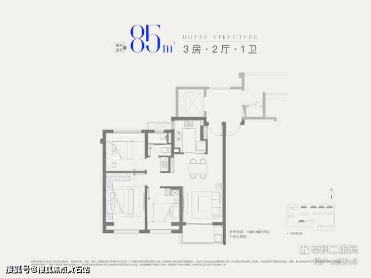 ●85㎡三房一卫(二/三期):总价320万起,两梯四户(有连廊),户型方正全明,南北通透,三开间朝南+短进深,采光通风俱佳,适配新婚家庭或三口之家。