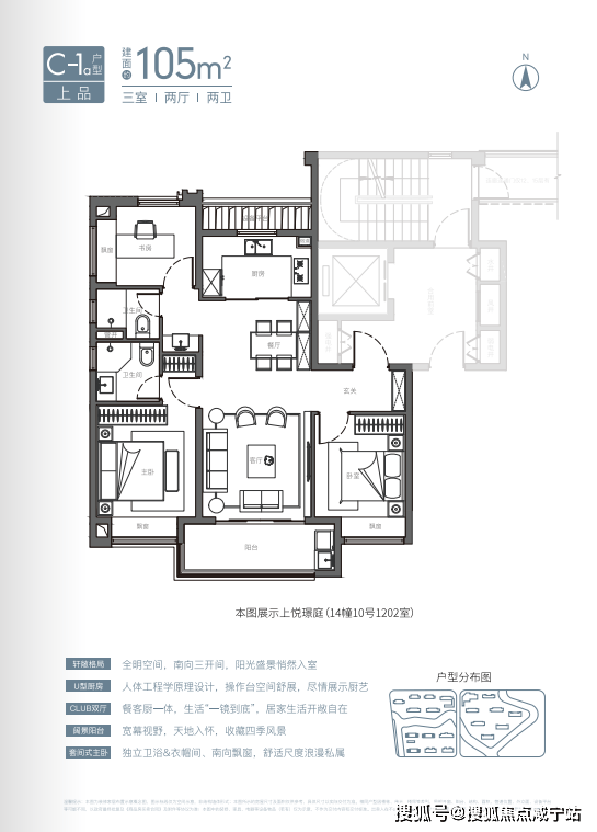 U型厨房、餐厅、客厅、阳台一线联通,南北通透。主卧套房、全卧飘窗、次卫干湿分离也都是标配。
