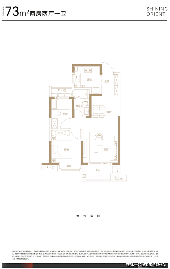 73㎡两房户型,小而精致,南北通透,户型方正,采光通风俱佳,另有多个飘窗赠送,极大的增加使用空间,功能合理居住舒适。