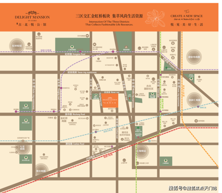 项目位于闵行金虹桥板块,毗邻古北国际社区,一路之隔是虹桥镇人民政府。西面除了金虹桥商业圈,还紧靠着文化名镇七宝古镇,南面毗邻徐汇漕河泾开发区,东面可直达徐家汇,属几大区域辐射的核心位置,距离虹桥交通枢纽约5公里。