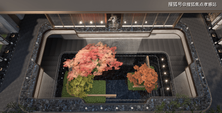 项目利用下沉式景观庭院,结合艺术花园、摩登水景等,打造了一座高端的下沉式会所,规划设有泳池、健身房、行政酒廊等场景。