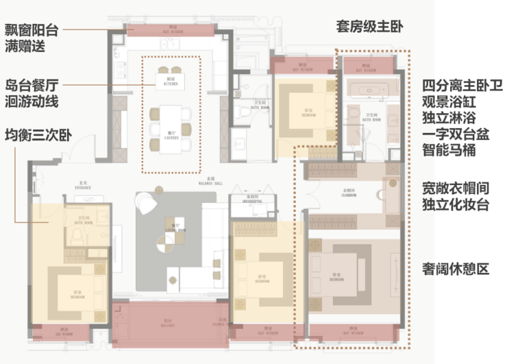 近40㎡主卧套房:主卧进一步升级,面积段来到接近40㎡,串联主卫与休憩区的独立衣帽间,四分离的主卧卫,观景浴缸位,都为体验感而来。