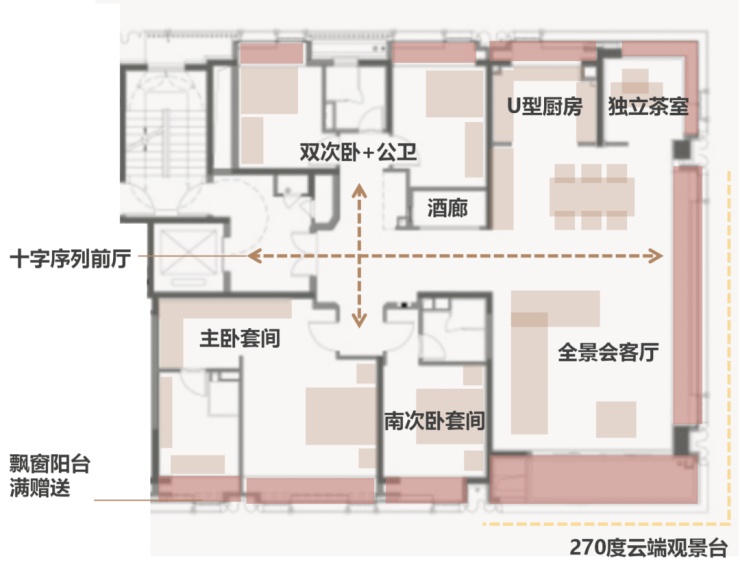 经典十字序列厅:从私享电梯厅开始,经由对开入户门,首先就进入这样一个十字序列厅,视线远处,就是尽头观景台,这条长廊,可以是公私分区的交通枢纽,也可以是彰显主人品味的艺术长廊;