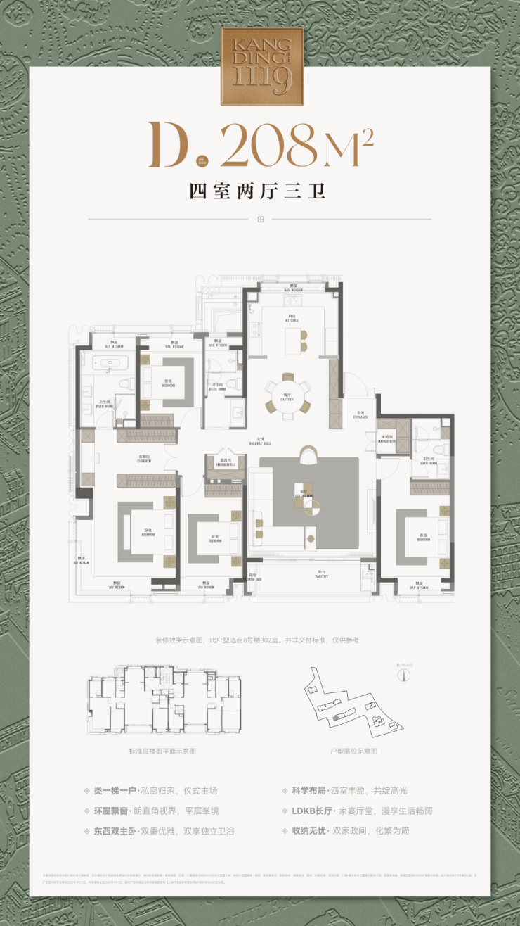 6米面宽LDKG一体化:客厅面宽来到惊人的6米,实际上,约208㎡户型已经可以说达到了总体4.5面宽。这样的一个巨厅,再加上南北通透一体化的优势,几乎可以容纳任何形式的洽谈或者聚会。