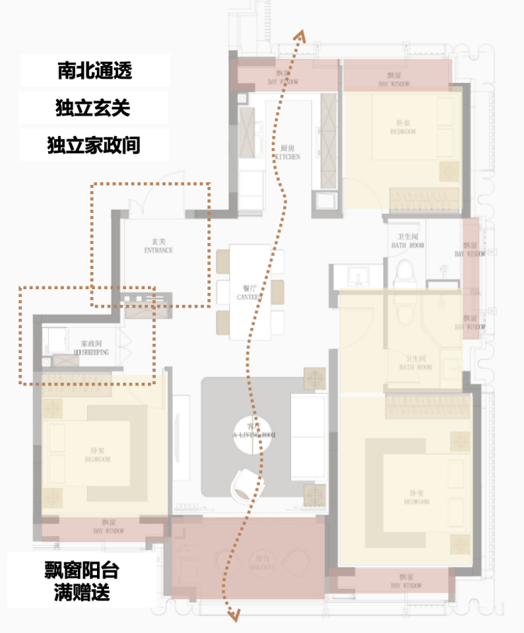 大三面宽朝南,四间卧室两南两北,平衡中正。