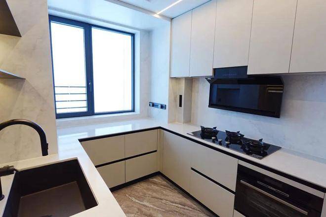 厨房部分,大得不像是107㎡该有尺寸,据说窗口下方位置是飘窗,借一部分空间,因此整体操作空间大大增加,喜欢用小家电的业主,也有更多布置空间了。