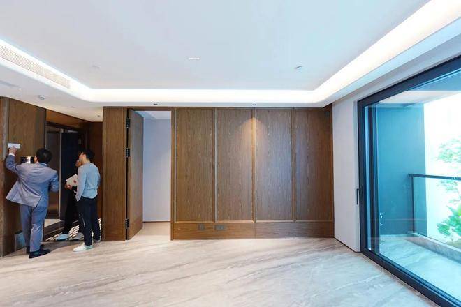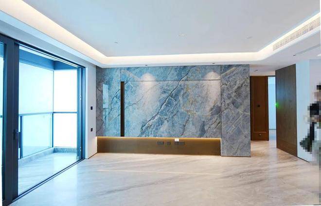 170㎡的客厅电视机背景墙比107㎡更深,但不变的是大理石花纹同样做到了衔接和统一方向,这对工人的要求就比较高了。