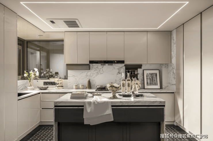 美学与场景的双重高定:摒弃传统豪宅的堆砌感,采用香奈儿式黑白撞色美学——入户黑色法式镶板柜配黄铜拉手,客厅悬浮吊顶裹环形灯带,让归家仪式感如走进高端奢品店;