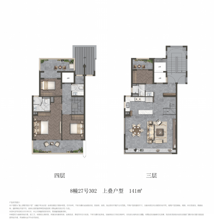 项目叠墅包含建面约141㎡上叠和建面约150㎡下叠