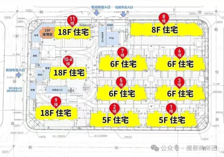 建筑层数:1#2#为5层,3#5#6#7#为6层,8#为8层,9#10-A#11#为18层,10-B#10-C#12#13#为1层,14#为3层。