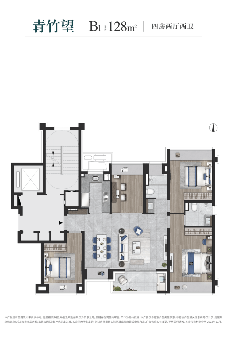 建面约128㎡的四房设计,在空间上使用功能更加扁平化,一站式解决了家庭生活的所有功能,优化居家动线,大大提升空间的居住体验。