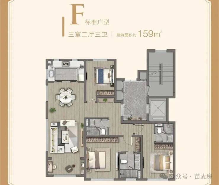 尤其是159㎡的三房,独立电梯厅的面积更是接近10㎡,进一步满足业主的个性化需求。