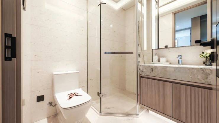 此外,3.15米的层高、全屋墙纸交付、皮质电视背景墙、一门到顶的房间门、灶台墙的整块玻璃、卫生间的整块大理石台面等等,看似不起眼的细节,背后都是精湛复杂的工艺和高昂的成本,宝华将自身对产品力的执着体现得淋漓尽致。