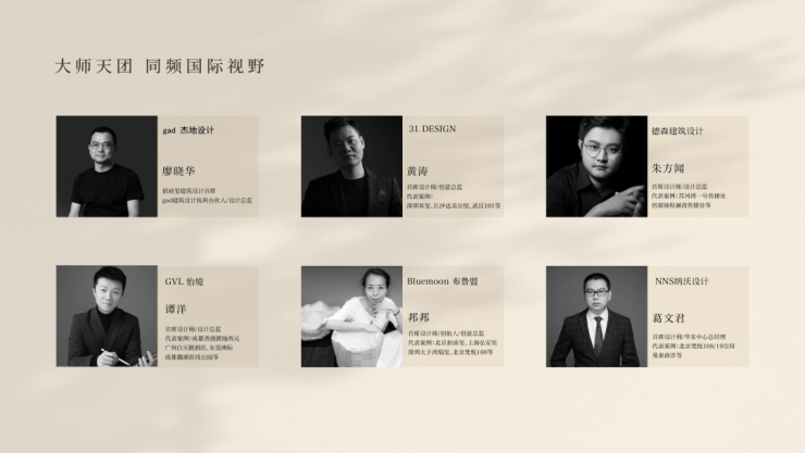 聚集享誉业界的团队——gad杰地设计、31.DESIGN、GVL怡境、德森建筑设计、NNS纳沃设计、Bluemoon布鲁盟