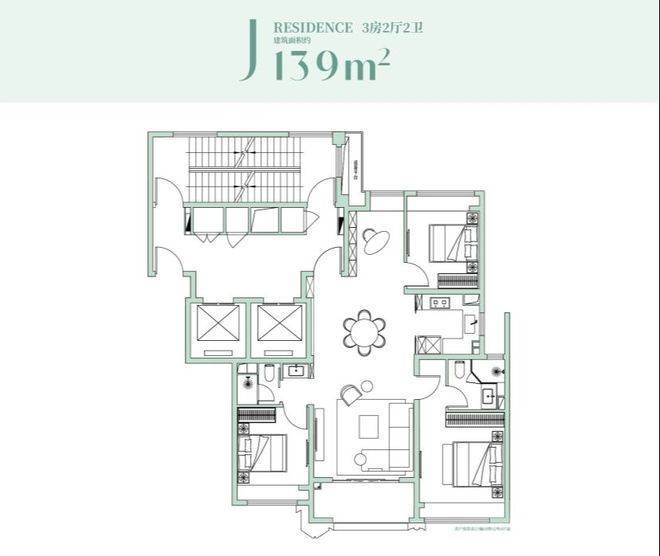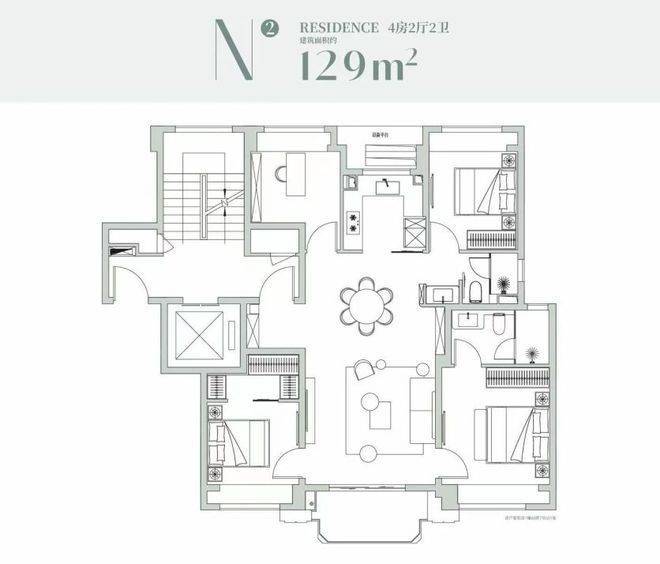该户型是经典的四叶草布局,四开间分布在四角,兼顾私密与互动,是二胎家庭的优选;