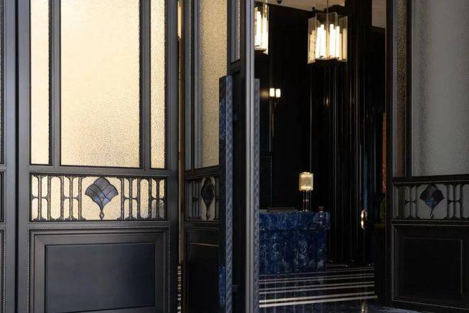 细节之处,光是一个接待台,就采用了产自玻利维亚约4500米海拔的高原矿脉——玻利维亚蓝石材,是世界上储存量最少的石材之一,非常珍贵;而大堂的柱子,也是巴西乌金奢石;
