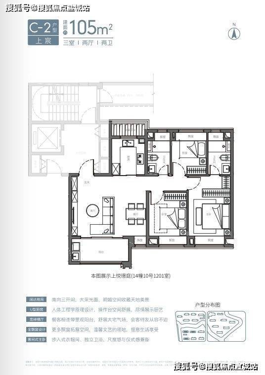 建面约105㎡3房2卫:项目建面约105㎡3房2卫有两种风格(宽厅、竖厅),尤其是宽厅户型,设计格外惊艳。