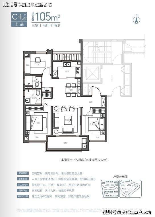 U型厨房、餐厅、客厅、阳台一线联通,南北通透。主卧套房、全卧飘窗、次卫干湿分离也都是标配。