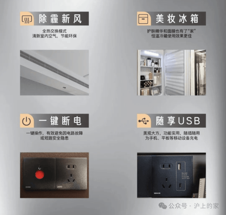 入户后,所有玄关柜均为交付标准,还精心配置了“除臭精灵”,下方更预留了扫地机器人的空间,为日常起居提供便利;像传统的豪宅三大件,项目采用大金品牌中央空调地暖两联供,以及格兰斯柯的新风。