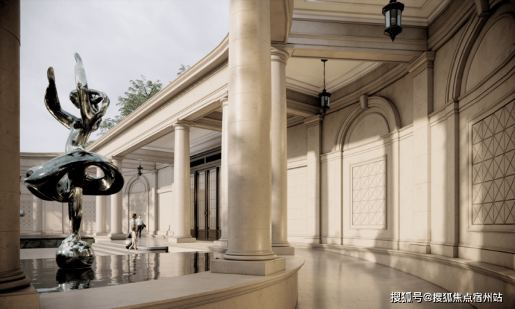 琉森水苑 &光影柱廊: 灵感源自法国夏洛特宫特罗卡德罗喷泉的经典水轴布局,接近黄金分割的比例,确保了无论从哪个角度看,都能获得最佳观景角度;除了 “颜值”够高,它还提供了遮阳避雨的功能,让归家之路更从容优雅。