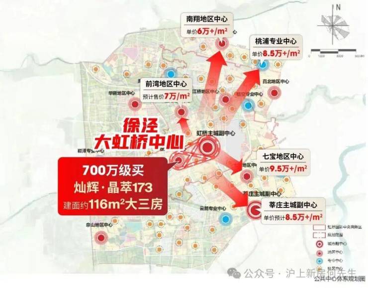 据销售人员透露,灿辉·晶萃173的总价在700-1000万左右,116㎡改善大三房总价700万级。而同样700万,只能买七宝、莘庄、桃浦等板块的90㎡紧凑户型,或者买南翔、华漕的100㎡户型。这些板块比起徐泾如何?