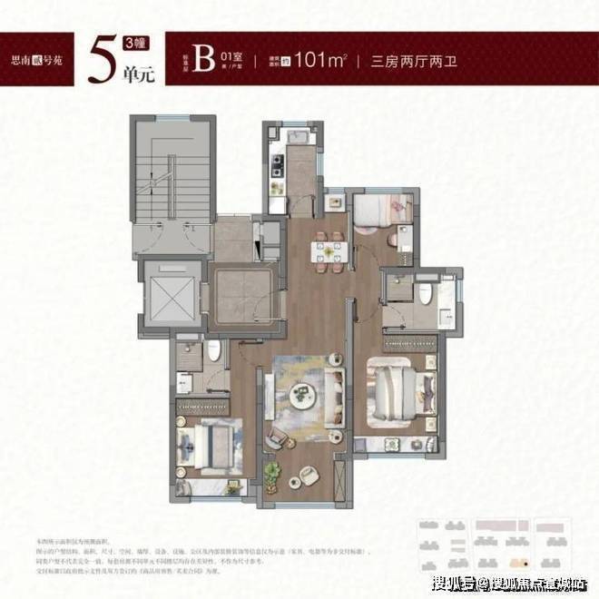 建面约100-101㎡户型,拥类独立电梯厅,无连廊+飞机户型南北通透。