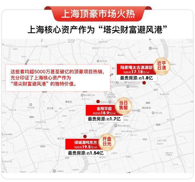 金陵华庭以18.9万/㎡均价当日售罄,陆家嘴太古源源邸近乎日清,绿城潮鸣东方更以19.5万/㎡均价开盘即日光,这些套均超5000万甚至破亿的顶豪项目热销,充分印证了上海核心资产作为“塔尖财富避风港”的独特价值。