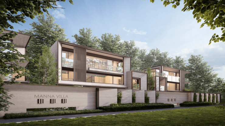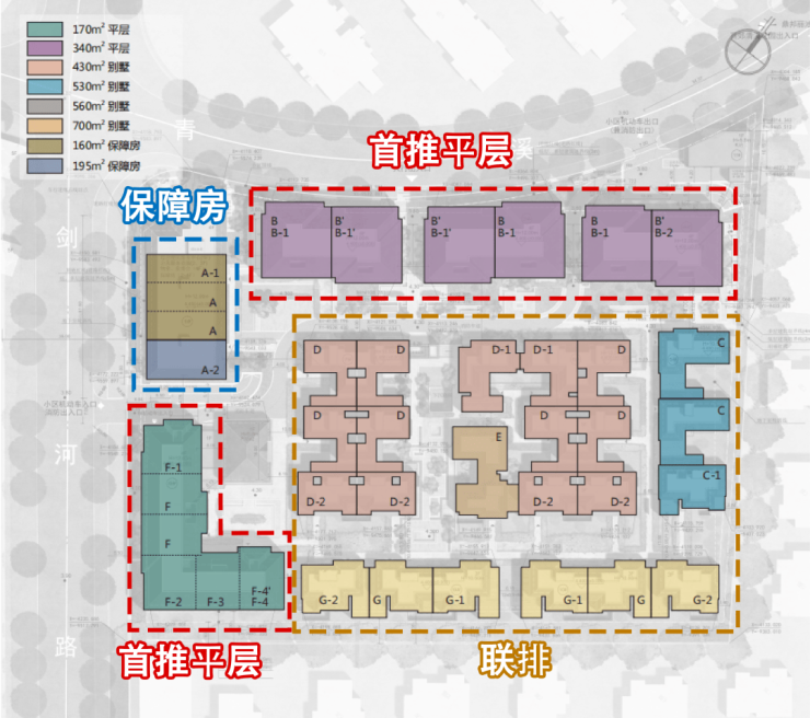 项目别墅是大头,且都是拼接型别墅:地上三层,地下一层,联排面积段为430㎡、530㎡、560㎡、700㎡,合计有23套。