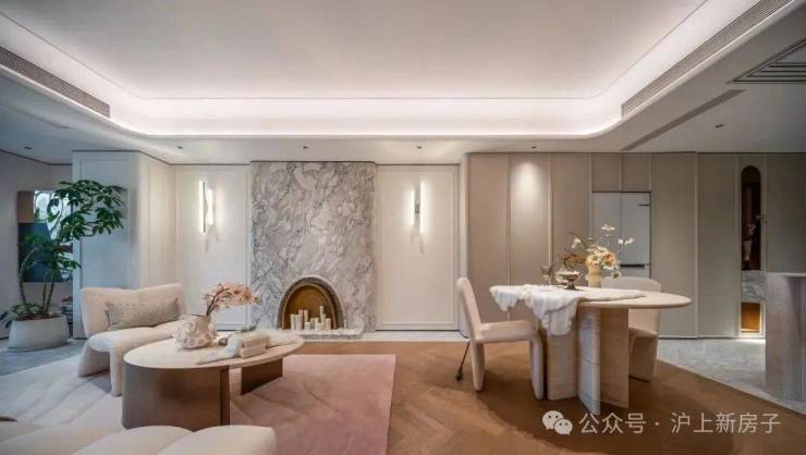 整个室内精装风格为此前大户型中最受欢迎的轻法式设计,弧形吊顶搭配无主灯设计,柔和浪漫氛围十足!还特地在客厅背景墙打造了弧形石材壁炉墙面、地面鱼骨拼实木地板与石材也做了弧形处理,提升空间灵动性,小资惬意~