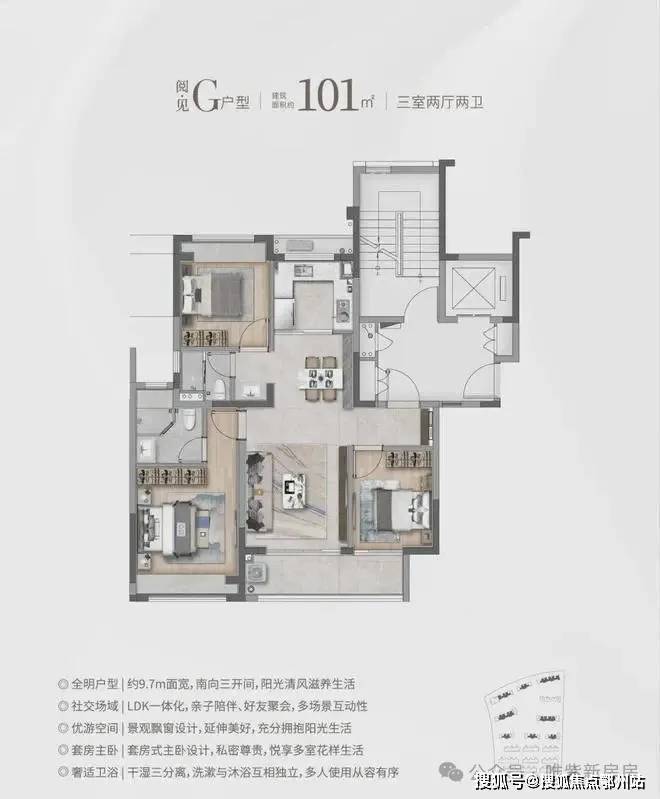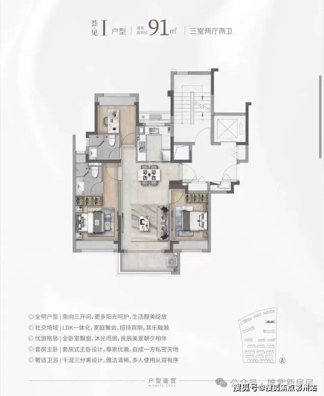 建面约101㎡精装3房,均价4.53万/㎡,总价400万级。采用霍尼韦尔新风、AO史密斯地暖 + 空调、西门子厨电(含洗碗机),全屋飘窗 + 无连廊设计,得房率超80%,每一寸空间都得到极致利用。