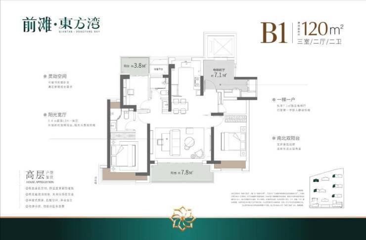 户型建筑层高3.1-3.15米,无连廊,双阳台配置。其中建面约103平户型2梯2户,其余一梯一户。