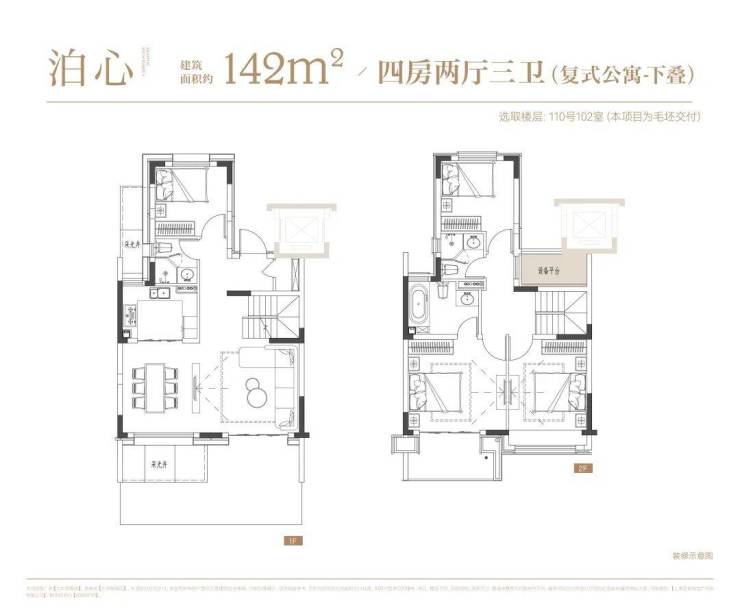 叠墅:叠墅一共四层,分为上/下叠,上叠建筑面积约139㎡,下叠建筑面积约142㎡。