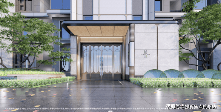 酒店式门廊作为归家的第一道风景,招商臻境以空间大尺度与高级奢石的材质使用将尊崇的归家礼遇感拉满。近50米宽,高度约5.3米高,开口约11米长的高规格酒店式大门。选用了贝金米黄石材作为墙面主材,墙裙用印度蓝石材做装饰。两侧甄选了两颗名贵的罗汉松,有着恭迎归家的美好寓意。