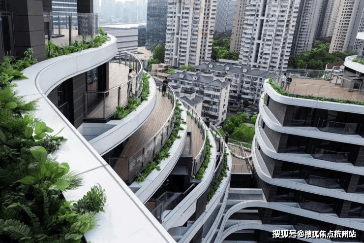 外立面采用玻璃幕墙现代简约风。建筑轮廓曲线蜿蜒,呈波浪线型层层迭高并后退,时尚感非常强。