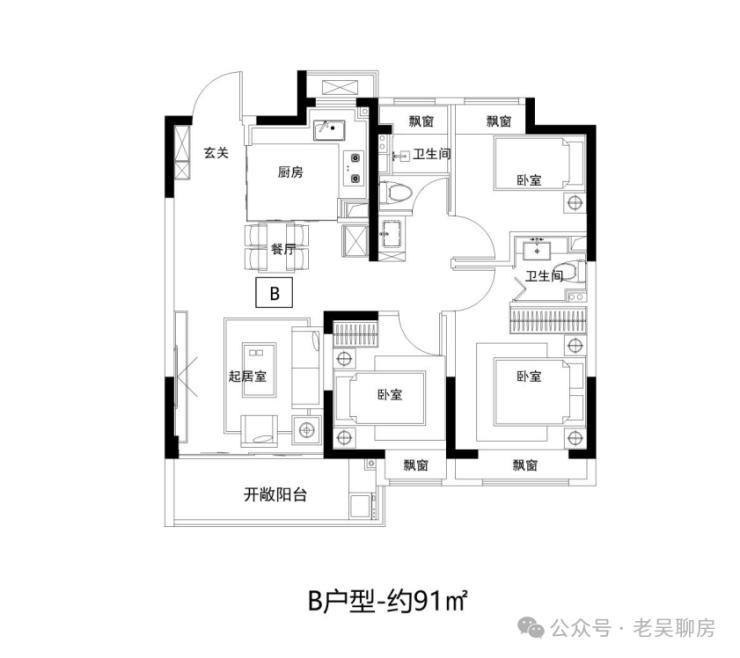 建面约91㎡3房2卫,三开间朝南,客餐厅连通大阳台,四飘窗设计,好户型该有的素质它都有。
