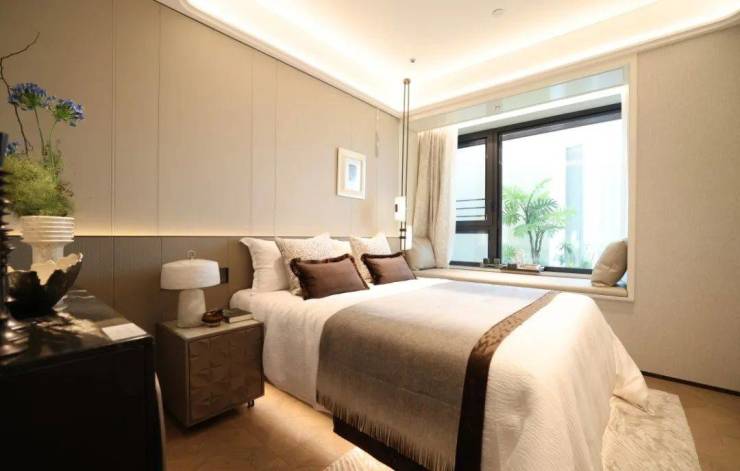 再来看看134㎡3室2厅2卫样板房。比起112㎡户型,这个客厅要宽敞很多,岛台也可以做成独立样式,摆放6人长桌也绰绰有余。主卧采用270度拐角飘窗设计,采光面拉满。