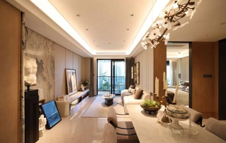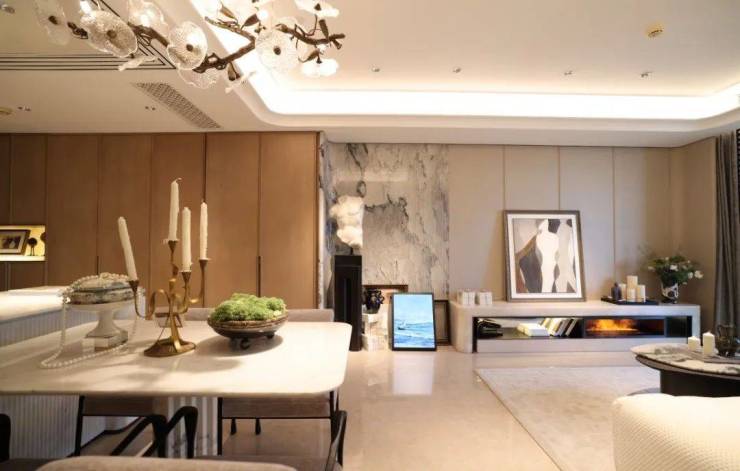 来到建面约112㎡3房2厅2卫样板房,设计主打海派风格,开放式厨房和西餐岛台,卫生间地面拼花,石材台面镀金龙头。标准的三开间户型,设计上将传统的过道改为餐厅空间,将公共区域做大了。